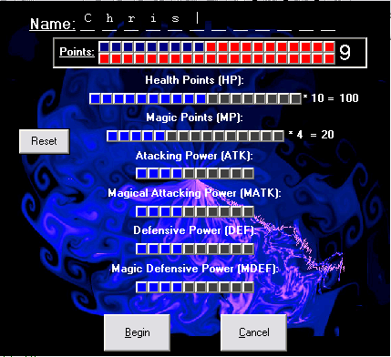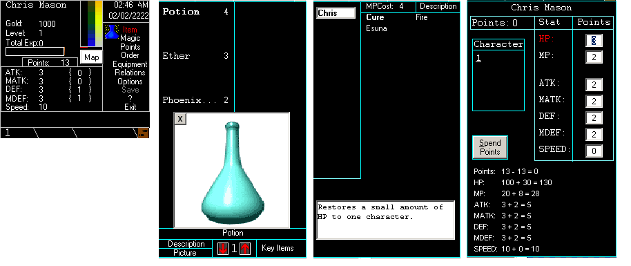 one of those projects that will probably never really be DONE as done as I'd like. It is an RPG that has a great story going for it, written by Wameng Lor. And the best graphics out of anythign I've ever made. Extensive menus, options save/load, great battle system, and constantly getting better. More will be written later, just getting up the link for this update