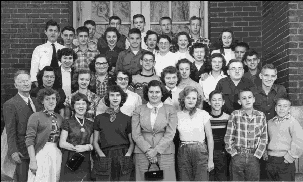 | EIGHTH GRADE 1st Row - Paul Cavanaugh, Janice Borders, Larry Fougerousse, Ruth McBride, Dian Burke, Donald Bennett, Jim Grady, Dolores McQueary, Ada Markle, Elizabeth Wesnidge, Ronald Eikelman, Sherry Grady 2nd Row - Teacher, Thelma Taylor, Bill LeDune, Nettie Borders, Frank Denny, Allen Rhoderick, Fred Stultz, Carolyn Fields, unknown, Lurena Neal, Mike Nadzieka, Thelma Jo Hutchison, Rita Foster, Don Atkinson, Ronald Pershing, Raymond St. John, Mary Irene Strait, Sharon Deitz, Bill Mears, Bill Coates 3rd Row - Bill Ringo, Hughie Cochran, Dorothy Downing, Max Griffith, Nancy Wooten, Joan Fougerousse, Jackie Borders, Caroll Thompson, John Henry Kent, Jeremy Crowell, Wilbur Borders, Mary Jo Porter, Shirley Gardner, Janice Ketchum, Betty Rine, Doris Marshall, Marjorie Borders |