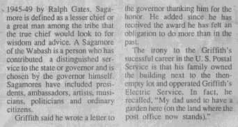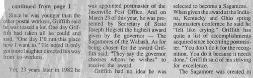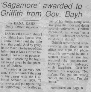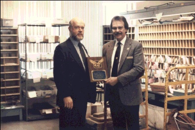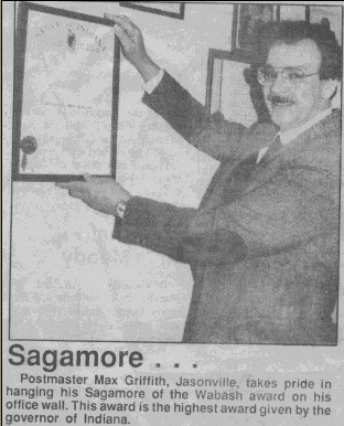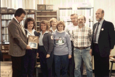 | Max is being awarded a plaque for being the best Level 18 office in the state of Indiana by Walter Morrison, manager of post office operations for the state of Indiana | ||||||||||||||||||||||||