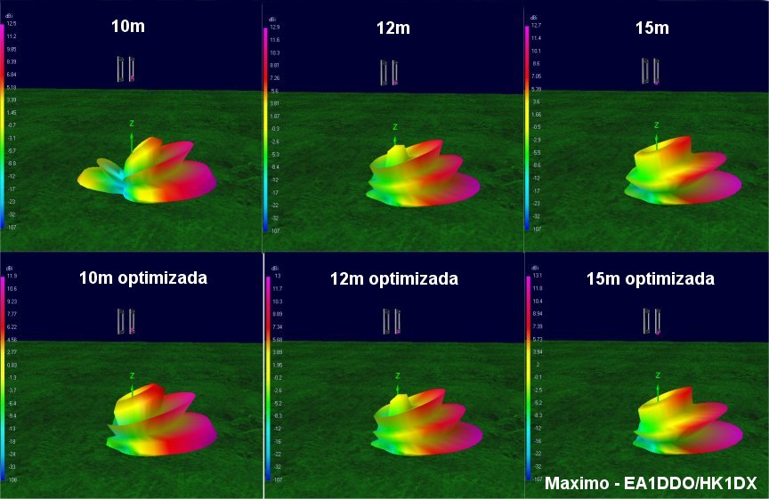 Para verlo mejor que con solo numeros, incluyo unos graficos 3D en color con las simulaciones de radiacion de la antena antes y despues de la optimizacion, en las tres bandas.