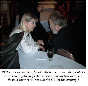 If you know of anyone who has been ill, please contact Fleet Surgeon Sharon Rebbel on rebsraft@comcast.net so she can send a card and we can post the information in the Scuttlebutt! Tribute To An IPC What is an IPC? Well technically IPC means Immediate Past Commodore. It is a transition seat on the board where the out-going Commodore has a chance to slow down before reentering the ranks as a member. The IPC is supposed to just enjoy being on the board with little responsibility other than to impart the wisdom they have gained over the past four years to the new board. Most officers aspire to this position as it means they have completed their commitment to the club and now have a year to adjust to the less hurried, less involved pace of Past Commodore. However, this year our IPC, Darlene Sauer was anything but less involved and she certainly was not slower. Darlene worked untiringly for Maryland Cruising Club. She put on the Commodore’s Ball, and Crab Feast. She, with VC Don Antos, facilitated the Bull Roast and Opening Day. There would not have been a Fleet Review without her efforts. She organized cruises and acted as Fleet Captain (Cruise Director) at many of them and she gave a helping hand to everyone else who conducted a cruise. She represented MCC at Balls and Openings and numerous Sister Club events. She did all this while still collating the newsletter, mentoring new board members, moving onto her boat, and holding down a very time intensive, stressful full-time job. The truth be told she was as dynamic an IPC as she was a Commodore. At the Change of Watch, she slipped quietly into the background and let the new Commodore, Don Antos, take the spotlight he has earned. She gave up her year of unwinding for the love of MCC and it’s members. She WORKED until the last minute of her term as IPC with none of the usual deceleration period. In a year that could have been a disaster due to lack of officers, she (and her not to be forgotten constant side-kick, Screwie Louie) braved the challenges without trepidation and helped navigate Maryland Cruising Club through rough seas. We owe Darlene an extremely large vote of thanks and should recognize the extraordinary dedication to MCC she has shown. Thank You PC Darlene, you will be a tough act to follow. - PC Chris and Pat Brettschneider Bull & Oyster Roast The MCC Annual Bull & Oyster Roast will be held on April 4, 2003. I know it’s early, but we need to begin planning efforts right away in order to have a successful and profitable Bull Roast. Remember, the Bull Roast supports the cruising events that we have scheduled for next season so it needs to turn a tidy profit. Lacking a Rear Commodore this year, I have agreed to chair this event and I would like all of us to have the best Bull Roast ever! We are asking every member to assist in selling Bull Roast and Raffle tickets. It is important for every member to participate in the success of the Bull roast! With your support and participation, we can turn this event into the Bull Roast of the season! Tickets will be available at the November meeting! Please plan on bringing a table of people to this fun event! Do your part to support our club—and have fun in the meantime! We have lots of surprises and fun ideas planned for that night, so please put this date on your calendar now! Bring your friends and help us to make this a special night in MCC History! - P/C Pamela Hunt Officer Highlight - Commodore Donald Antos Editor's Note: In an effort to familiarize members with each other, each month, the Scuttlebutt will highlight and profile either a member or an officer of the club. Be sure to say hello to them when you see them on a cruise! Commodore Donald Antos, born and raised in Baltimore, was educated in the public school system. He graduated from the Johns Hopkins University School of Engineering, studied law at the University of Baltimore and completed the MBA program in Finance at Loyola College. He also spent two years as an enlisted man in the U.S. Army Signal Corps. Don spent many years in the Aerospace and Electronic industry. He began as an engineer with a local company designing radar and 1FF systems. Subsequently, he joined a start up company to design and manufacture telemetry equipment for U.S. missile systems. The firm grew to 200 employees and Don to the position of Director of Operations. After the sale of the firm to a major U.S. company, Don joined the Department of Defense where he was in charge of the design of large, high-speed digital systems used for processing signals from intelligence collection systems. Don is retired and lives with Rosalie, his wife of over 48 years, in the Dulaney Valley area. They have three children and five grandchildren. The family has been in boating for close to forty years. For the past twenty-three years, they have enjoyed the Chesapeake Bay as an owner of a waterfront home on Stoney Creek. Don's a Past Commodore of the Maryland Cruising Club. a Past Commodore of the CBYCA, a member of the Chesapeake Commodores Club and the National Boating Federation. Don is looking forward to bringing his organization and management skills to the office of Commodore of Maryland Cruising Club. Silent Auction, Raffles, Prize Wheel, Door Prizes I know it’s a long time until the Bull Roast in April, but if you’re a crafter and have a job and know the holidays are in there somewhere, it’s really not that long. Before you know it you will be very busy. That’s why it’s important to start working on your contributions today. For those of you who are new to the club we do fund raisers every year to build a budget large enough to conduct club business, put on charitable fundraisers and have FUN. Without your support both by selling tickets and donating items and time we cannot meet our goals. Every club member needs to be involved at the highest level they can in order to reach success. The Bull Roast in April is our biggest fundraiser; the Silent 