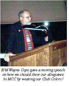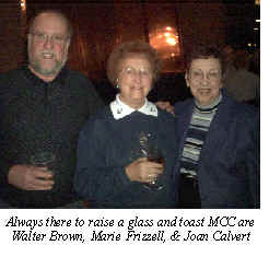 The next C.B.Y.C.A. meeting will be held at Kent Island Yacht Club February 15, 2003. - B/M Al Freedman New Members The following prople were voted on during the November General Membership Meeting: Troy Brooks & Carla George W. McManus, Sr & Ann Dennis Lunsford Buzz Wilson & Cindy Barbara Bishop Let’s welcome them to MCC! - V/C Dottie Murray 2003 Roster First, let me apologize for not having the roster available to you at the November General Membership Meeting. My brother had broken his leg pretty seriously and was operated on that Friday, November 15. I had fully intended being back from the Frederick Hospital in time to come to the meeting, but, as with many operations, time ran much longer than expected and I didn’t make it home until almost 10 PM. Therefore, the roster was not available to those attending the meeting. In order to rectify this situation, I will move printing of the roster back one month and have the draft roster available at the December meeting. Please plan to attend the meeting on December 20 and see me to review your entry in the roster for accuracy. The final version of the 2003 Roster will then be available at the January General Membership Meeting scheduled for Friday, January 24, 2003. Please plan on attending both of these fun events to first review, and then pick up your copy of the 2003 Roster. By picking the copy up yourself, you eliminate the need to mail a copy, saving the club hundreds of $$$ in mailing costs. Remember, the costs that we save will allow us to spend more money on fun events for you and your family. - P/C Pamela Hunt 2002 Commodore Ball First, on behalf of Rosalie and myself and the Officers and Board Members of MCC, thank you for attending the Commodore’s Ball on November 2ndat Martins East Wind. It was a pleasure to spend an evening with you. We will treasure the videotape from that evening. We opened the Ball with a cheese and vegetable table, butlered hors d’oeuvres and an “out of this world” crab dip. The bar service was the top of the line. When it came time to start the program, I sent P/C Betty Stahler up to the podium and next thing I knew she wasn’t there. This happened about four times. Finally, she introduced Mistress of Ceremonies P/C Pamela Hunt and we got things rolling. Thanks to Pam, we were able to present each representative from a visiting organization a framed replica of the flag of their office. In all, we handed out 33 of these keepsakes. Pam did a great job of moving the program along. We completed the ceremonial activities in exactly one hour which put us on schedule. The dinner service of prime rib/sautéed chicken and the background music by “Robin & the Rhythmix” were great. We danced and acted crazy for the next three hours and at midnight we still had a full dance floor. That was a good indication that the guests were enjoying their night out. Everyone took home a souvenir MCC engraved glass. The lucky ones took home an electrified lighthouse that was the guest table centerpiece. Rosalie and I attempted to plan a Commodore’s Ball that would be satisfying for our guests. At the end of the evening on November 2, we thought we had achieved our goal. We were even more pleased by the comments we received from people over the next week. I think P/C Betty Stahler’s comment sums it up: “I wouldn’t have changed a thing.” - Commodore Don Antos Scuttlebutt On The Web The Scuttlebutt can now be viewed on the web. Each month, once the newsletter is complete, it is passed to the printer for printing and mailing to our members. Last month, I took the Scuttlebutt to the post office to mail. Since V/C Dottie had taken the copies for the officers at the Board Meeting, I was able to remove those people from the mailing list. Therefore, I mailed 54 copies of the Scuttlebutt at $.60 each. I also mailed 2 copies to our Club Historian Bob Grepps at a cost of $1.06. Therefore, the cost to mail the Scuttlebutt ended up being $33.46 for just one month. That means that we spend over $400 for Scuttlebutt mailing each year. In an effort to reduce these costs, we are asking people with access to the web to obtain their copies of the Scuttlebutt online and eliminate the mailing. The savings that the club can realize will provide us with additional funds to spend on cruises and other events. If you would like to assist in reducing these costs, please email me at oliviakay@cablespeed.com and let me know that you no longer need a mailed copy of the Scuttlebutt. Your efforts will go a long way to reducing the mailing expenses. If you would like to view the newsletter information on the web, follow the steps below: