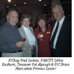 After an adult beverage or two, the social hour ended. We proceeded to have a delicious meal followed by a short business meeting. I/P/C Angela Krzystan, Chairperson for the MCC Christmas party, discussed the Friday December 20th event. She encouraged everyone to bring a gift and participate in its exchange. She reminded everyone to bring his or her Christmas cards. Santa will make his appearance and spread the Christmas spirit. Brush up on the words to your Christmas carols. Our Treasurer, Pat Alpaugh, presented the 2002-2003 MCC budget to the membership. It was quickly approved. It was noted that we hope to conduct a special fund raising event to feed the kitty. It was acknowledged that our Immediate Past Treasurer, Shirley Poling managed last year’s budget to within an eyelash of a breakeven year. Hats off to Shirley for a job well done. Our V/C Dottie Murray reminded us of the MCC motto: “Meeting and Cruising Frequently in an Atmosphere of Sociability and Good Fellowship.” I hope our folks will keep it in mind. I have learned that life is very short and I better enjoy it while I can. I come to the club affairs to have a pleasant time. I make an effort to come with a smile on my face. If I happen to have an unpleasant encounter, I try to find the compassion in my heart to set it aside and let it pass. Remember, you can control how you feel. V/C Murray planned the evening honoring our 2002-2003 Princess, Laura Kaelber. We are delighted to have Laura back for a second year. Laura will give up a lot of her free time to serve as the MCC Princess. When you see her, give her your thanks. I had the tough job of crowning Princess Laura with her tiara, after which she had the pleasure of opening several gifts that she received. The MCC is very fortunate to have a V/C with the experience and know how that Dottie Murray possesses. A sign up sheet was passed around the room with the result that 32 people made a dinner reservation for the Friday, December 20th Christmas Party. This will certainly lighten the telephone contact load for the Events Committee. I thank all the folks who signed up. By the way, P/C Brian Hunt has volunteered to be Chairman of the Events committee. If the need arises, you can cancel a dinner reservation, but it has to be done no later than the last Monday prior to the Friday meeting. We have agreed to advise the Sparrows Point banquet manager of our needs on Tuesday mornings at 9 o’clock. Your cooperation is greatly appreciated. From now on contact P/C Brian Hunt to make a dinner reservation. I hope each and everyone had a safe and enjoyable Thanksgiving. - Commodore Don Antos Vice Commodore Report It was great to see the fine turn out for the Princess Installation Party. Maryland Cruising Club is honored to have Princess Laura Kaelber represent us again this year. Last year Laura spent a lot of her free time as Princess attending Commodore’s Balls, Opening Day Ceremonies, participating in the Queen of the Chesapeake Contest and attending many MCC club functions and functions of our sister clubs. We are looking forward to another great year escorting Princess Laura around the bay. The MCC Annual Christmas Party on December 20th is our next big event and is being planned by IPC Angela so if she calls you to help, please say yes. Don’t forget your gifts and your cards that evening. This is a great evening for fun and fellowship. The Members Appreciation Party, another party opportunity, will be the 4th Friday in January. The date is January 24th so please mark this date on your calendar. This is a change from our normal schedule of the 3rd Friday in the month, and the change is due to a prior booking by Sparrows Point Country Club. We will be having a short business meeting first @ 7:30 PM (another change) and dinner will be served at 8:00 PM. This will be a mystery dinner but I guarantee that you will enjoy it. We will be having music and entertainment following dinner, so please come and let your officers show their appreciation. We are looking for new members who like to have fun. So if you know anyone who would like to join, now is an excellent time. The initiation fee on Membership Applications has been waved for new members. Spread the word. Let everyone know that we are a great club. You can find an application for membership on the MCC website, http://www.oocities.org/mdcruising. Please call me if you have any questions. Please keep in mind all of the upcoming events. We will need your help to successfully execute them in the manner that is expected of Maryland Cruising Club. We will be asking you to solicit pledges for the Walk-A-Thon for Parkinson’s disease, sell tickets for the Bull Roast, donate items for the auction and sell ads for our Opening Day program. All of these events require the memberships help. A club is only as good as their members, so please help us to continue to have the best club on the bay. - V/C Dottie Murray December Calendar Schedule of Events 12/04—Board Meeting, 7:30 PM at Maryland Yacht Club 12/16—Deadline to call for Dinner Meeting Reservations. Contact E/C P/C Brian Hunt For dinner reservations 12/20—December General Membership Meeting—7:00 PM. Contact E/C P/C Brian Hunt For dinner reservations 12/25—Christmas 12/31—New Year’s Eve December, 2002