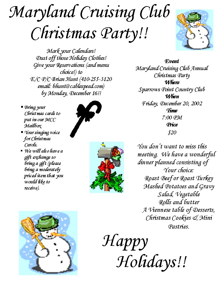 Birthdays & Anniversaries Birthdays 12/19—Marilynn Zullo 12/19—Don Kaelber 12/20—P/C Mike Murray 12/24—Louis Karageorge 12/27—Mary Gunther 12/28—F/C Joanie Ridnour 01/01—F/Chaplain Fred Levitan 01/08—Jean Troy 01/09—P/C Angela Krzystan Anniversaries 12/17—Warren & Libbie Eastburn 12/19—Tommy & Judy Chalk 01/02—Edgar & Betty Mosier 01/10—Ed & Adele Bruette 01/15—V/C Dottie & P/C Mike Murray Christmas Party--Click Here For Flyer Please be sure to mark your calendars for the Annual Christmas Party to be held on Friday, December 20 at Sparrows Point Country Club! A festive time is sure to be had by all. There will be the opportunity for a gift and card exchange. Anyone who brings a gift will be eligible to receive a gift! Please keep the gift range in a reasonable amount, we aren't expecting to get the keys to that new boat! For those of you who have not been to our Christmas Party in the past, the gifts range from small items of giftware, to boat accessories, to a popular liquor or wine, and there is even usually a whimsical item. You are sure to go home with a special memory from the evening. And, you never know, we may be able to get a visit from the Maryland Cruisettes! Don't forget - all dinner reservations must be called in to E/C P/C Brian Hunt (410-255-3120) no later than Monday, December 16, 2002. Dinner will be: Roast Beef or Roast Turkey Mashed Potatoes and gravy House Salad Chef's vegetable Rolls and butter Coffee and tea Viennese table of desserts. Christmas cookies and mini pastries - IP/C Angela Krzystan Member Appreciation Party The Member Appreciation Party (previously known as the “Officer’s Cocktail Party”) is scheduled for our January meeting to be held on Friday, January 24, 2003. This event is to toast the members of MCC and thank them for all of their continued support of the club throughout the year. Lots of fun is planned for this year’s party—including a Mystery Dinner, Music, and Dancing! Please plan on joining us for our annual Member Appreciation party to be held at Sparrows Point during the normal dinner meeting. Wear Your Colors Lets be proud and wear our colors for the good of the club! Have you got an item with the club logo on it? If not, you can order high quality, extremely attractive shirts, sweaters, jackets, caps, jewelry, and other items. Please contact Chaplain Fred Levitan to order clothes and Vice Commodore Dottie Murray at to order jewelry. Please wear our colors at all our fabulous MCC events. - B/M Wayne Cope CBYCA Delegate Report The last meeting of the Chesapeake Bay Yacht Club Association (CBYCA) was held at Bush River Yacht Club on Saturday, November 16, 2002. This meeting was also the change of watch. Newly elected Commodore is Ken Bean, Vice Commodore is our very own P/C Betty Stahler and Rear Commodore is John Garlotta. Also, our very own Dion Guthrie won the Harford County election for councilman. Two new clubs were elected into CBYCA. They are: Chesapeake Cruisers Association & Admirals Annapolis Yacht Club. Charles Tulip has resigned as Maryland Legislative Director (he’s going cruising). Coles Marsh of Admirals Annapolis is taking Charles place. The following issues were discussed: