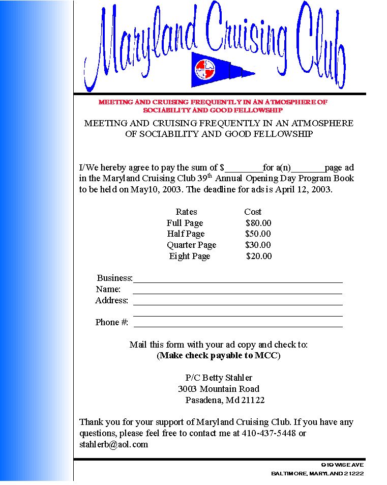 - V/C Dottie Murray Sick & Welfare If you know of anyone who has been ill, please contact Fleet Surgeon Sharon Rebbel so she can send a card and we can post the information in the Scuttlebutt! Glad to hear that Dick Sulcer is feeling much better after his hospital stay. When you ask Dick Sulcer how he’s doing he would always say, "I'm overworked, under paid, my martinis too warm and I'm not getting enough". That’s exactly what I heard when I called to see how he was doing. Some things never change. Continued get well wishes to Libbie Eastburn. We are all very happy to hear that your surgery went well and that you are on the road to recovery. If you get a chance, give Libbie a call or send a card. I’m sure that she will enjoy hearing from you. Ivy Broscoe is back in the hospital again. This time with a bout of pneumonia. Get well Ivy. We don’t know what kind of trouble George is getting into while you’re away. Please keep all of our members in your thoughts and prayers. - V/C Dottie Murray Birthdays & Anniversaries Congratulations to Everyone who is celebrating a special day this month! Birthdays 04/18—Barbara Nazmack 04/18—James Milner 04/25—P/C Jerry Troy 04/27—Larry Damour 04/29—Ron Rebbel 05/01—Sheila Summers 05/05—P/C Gus Kaminaris 05/10—Shirley Poling 05/12—Robert Lindgren 05/13—George McManus, Sr Anniversaries 04/18— Treas Pat & Kent Alpaugh 04/28—Donald & Pamela Kaelber 05/07—P/C Gus & Fannie Kaminaris 05/09—Steve & Sheila Wurst -V/C Dottie Murray Scuttlebutt On The Web More and more people are viewing their Scuttlebutt on the Web! Periodically, I look at the site statistics on Geocities.com and I am amazed at the number of hits we are getting on our little site. I’m still looking for someone to take over maintenance of the web site for when Brian and I leave for southern waters in November. Please remember, that all you can do to help our little club is most appreciated. I will be happy to train my replacement on updating the web site. It’s very easy and just takes about an hour each month to get the Scuttlebutt updated and accessible for web viewing and a few hours each year to update the Officers, cruising & meeting schedules! Please contact me if you are interested in this job. - P/C Pamela Hunt PS: Sec Bev Madden is taking over roster maintenance! Opening Day Program Book Maryland Cruising Club will be celebrating our 49th opening day ceremonies on May 10, 2003. We are in the process of compiling our Opening Day Program Book. As members of MCC, you are given discounted prices for advertising. Please support your club by placing an advertisement. See flyer in this Scuttlebutt for prices and sizes. If you would like help in creating an ad, please call me. - P/C Betty Stahler 410-437-5448 Need an Opening Day Ad Order Form? Click Here Bull & Oyster Roast On Friday, April 4, 2003, half of our club membership got together at Columbus Gardens and partied the night away! Along with half of our memberships were all of their friends and family for a total of about 300 people who gathered together to eat, drink, and be merry! The evening was highlighted with many lovely gifts that were set out at the Silent Auction as well as the Prize Wheel. Most of these gifts were given an appealing presentation with the help of Pat Brettschneider, artist and craftswoman extraordinaire. The Big Six Wheel was once again manned by our P/C “Big” Mike Murray who, with his band of merry men, managed to wheedle away about $525 from the willing patrons! Duane Skinner managed the Prize Wheel, and along with his Prize Elves, netted $617. He also brought home $300 by treating 2 unsuspecting patrons to $150 each by selling 60 “lay downs” per game—many of which were sold by Pat Brettschneider’s sister Barbara (you may remember Barbara as the clown at a recent Walk-A-Thon—sshhh, don’t tell the kids her secret)! The Silent Auction, manned by Pat Brettschneider pulled at the purse strings of the many “shoppers” in attendance and brought home $804, sending the shoppers home satisfied as they took away their newly purchased items, most of which were donated by our fellow members! The “Winner’s Choice” raffle, which netted $448.50, was won by none other than P/C Gus Kaminaris who selected the TV/DVD Combo. Our very own P/P—P/Q Katie Murray and her friend Ryan spent the evening selling tickets and the last minute tickets were walked around by Pat’s sister Barb to be sure that no one was missed! In the absence of our Princess Laura (who had SATs the next day) P/Q—P/P Katie drew the winning ticket! Meanwhile, at the front door, Sec Beverly Madden, F/Surg Sharon Rebbel, and I pulled in about 300 people. Brian’s daughter, Jeanine Hunt, brought home $99 after selling “Pop-Opens”. She had several happy $10 & $25 winners! Once everyone had arrived, we closed up shop at the front door and began pulling ticket stubs for door prizes. About 50 door prizes were pulled, tagged, and set on the “Winner’s Table” for pick up by the patrons! People were everywhere that evening—some chit-chatting at their table, some viewing the items on the Silent Auction, some trying their luck at the Prize Wheel or the Big Six Wheel, some dancing, and still others perusing the Winner’s Table in hopes of seeing their name there! All of the gifts were gone by the end of the evening so everyone must have hit the table and gotten their booty! All in all, it was one fun night, with something for everyone and we managed to make $4,133.33 for the club. Many, many thanks to everyone who helped, everyone who brought friends and family to fill the tables, and everyone who made the evening a special, fun event for MCC! If you were there—many thanks for coming and helping to spread good cheer! If you missed it, plan on attending next year (scheduled for April 2, 2004)! We promise you just as much (if not more) fun! Uniform Of The Day! The uniform of the day, effective 4/03