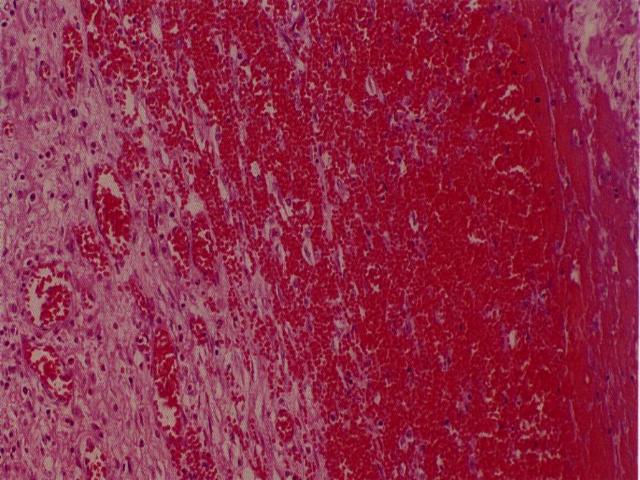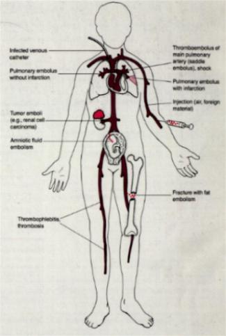El Tromboembolismo pulmonar (TEP) es una patología frecuente del pulmón. El TEP es una secuencia de eventos que comienza con la formación de trombos en órganos a distancia conectados al pulmón por circulación venosa. Es importante mencionar que el pulmón es el único territorio capilar que recibe circulación venosa en forma aferente, por lo que cualquier trombo generado en distintos órganos tiene el riesgo potencial de afectar el capilar pulmonar. La migración del trombo al pulmón se llama embolo y de ahí el término trombo-embolismo pulmonar. La principal causa de TEP es la trombosis venosa profunda. Esta y otras causas de TEP se muestran en la figura [imagen]. Como se observa diversas causas además de la trombosis pueden ser causa de TEP como por ejemplo la embolía de líquido amniótico o la embolia grasa [imagen].. La gran mayoría de los TEP son subclínicos, son microembolías que en forma crónica pueden llegar a provocar Hipertensión Pulmonar. Sólo los TEP masivos pueden provocar sintomatología clínica [imagen]. Los cortes histológicos de esta lesión revelan un trombo organizado compuesto por capas alternadas de eritrocitos y leucocitos / fibrina [imagen]. La consecuencia de esta lesión en el pulmón será la hemorragia [imagen] y el infarto hemorrágico del pulmón.[imagen]