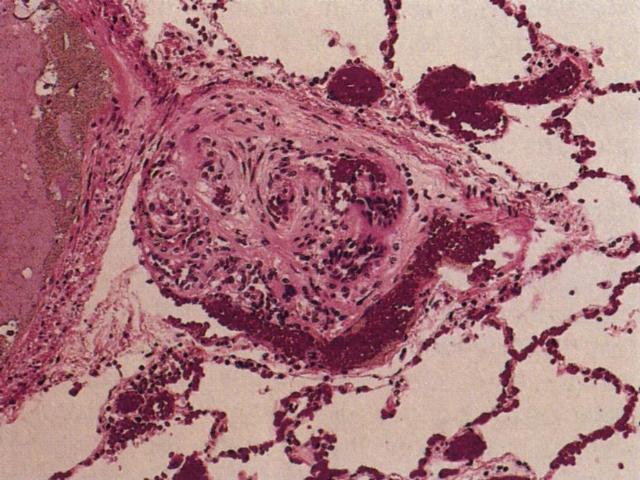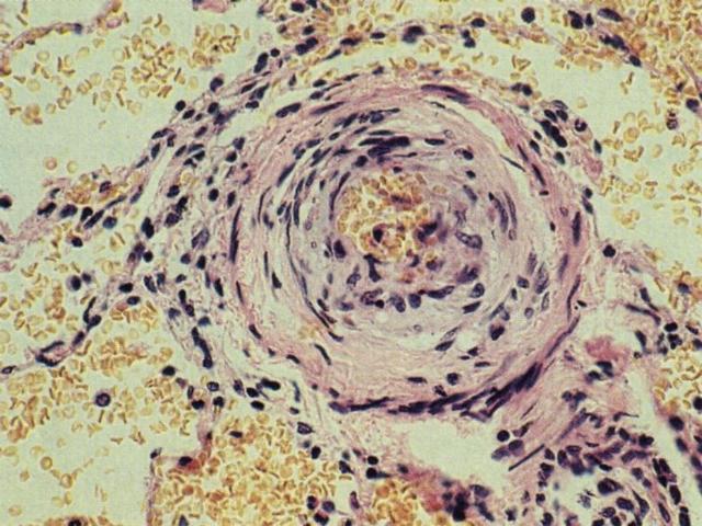 La hipertensión pulmonar es el evento final del edema pulmonar, ARDS o TEP, cuando se ha superado la gran distensibilidad del territorio vascular del pulmón. También patologías asociadas a severa hipoxia, producen por vasoconstricción, hipertensión pulmonar como el enfisema o enfermedades restrictivas. La célula endotelial del capilar pulmonar es la responsable de esta patología y refleja un daño celular reversible con la secuela de disfunción celular. Existe un forma menos frecuente de hipertensión pulmonar, que es la forma ideopática o primaria. La importancia de esta patología es que permite estudiar al disfunción de la célula endotelial fuera del contexto de patologías crónicas de larga evolución, responsables de la hipertensión pulmonar secundaria (edema, ARDS, TEP). En este contexto se ha descrito asociación a patología autoinmunitarias o de exagerada liberación de moléculas con acción vasoconstrictora como endotelina. También se ha postulado un rol de las células musculares lisas de la pared vascular y el vasoespasmo. Histológicamente las lesiones vasculares de la hipertensión pulmonar son variadas y no existe una morfología característica de las HTP 1ria o 2ria., sugiriendo que ambas podrían tener una patogénesis común. Una representación esquemática de la morfología en etapas temprana y tardía de la HTP se muestra en la figura [imagen]. La presencia de hipertrofia de la capa muscular [imagen] y la proliferación plexiforme de la íntima [imagen] son morfologías centrales en la HTP.