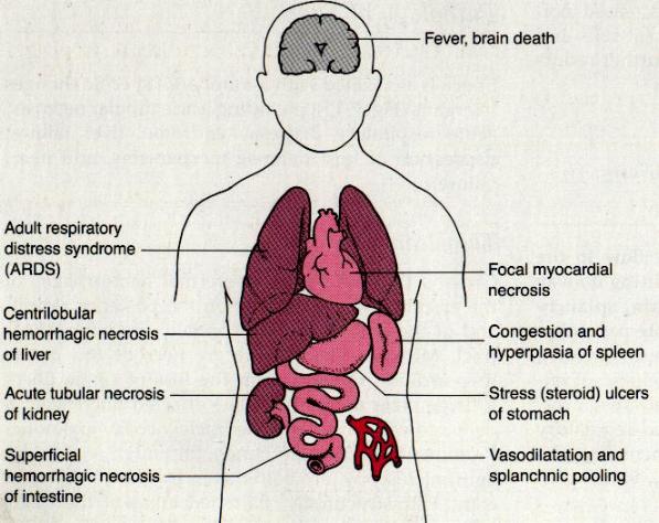 El Sindrome de distress respiratorio del adulto o ARDS (Adult respiratory distress síndrome) es el ejemplo pulmonar, de patología vascular por daño de la membrana endotelial. En la circulación sistémica este tipo de patología vascular se denomina shock séptico, y ocurre porque microorganismos dañan directamente la pared endotelial. La sobreposición entre shock séptico y ARDS queda demostrada porque ARDS forma parte de las manifestaciones del schok séptico [imagen]. El ARDS tiene numerosos sinónimos como pulmón de shock, daño alveolar difuso o pulmón traumático. El hecho central del ARDS es la disfunción de la unidad alveólo-capilar. Los cambios morfológicos característicos de ARDS son congestión y edema, al igual que en el edema pulmonar, pero además depósitos de fibrina denominados membranas hialinas. Estos depósitos están presentes en toda la superficie alveolar impidiendo el intercambio de oxígeno y consisten en un precipitado proteico y lipídico. El componente proteico de las membranas hialinas proviene de neumocitos y células endoteliales necróticas (reflejando el daño de la unidad alveólo-capilar) y los lipídicos del surfactante pulmonar precipitado. En forma reactiva hay proliferación de los neumocitos tipo II. En la patogénesis del ARDS el fenómeno central es el daño de la unidad alvelolo-capilar. El Sindrome de distress respiratorio del recién nacido es una patología similar al ARDS, excepto que en la patogénesis, la enfermedad pediátrica se debe a falta de surfactante pulmonar, en cambio en el adulto (ARDS) el daño es una injuria directa contra la célula endotelial del capilar pulmonar y/o, en menor frecuencia, contra el neumocito del saco alveolar [imagen]. El daño de la célula endotelial se cree se debe a la liberación de mediadores químicos de la inflamación aguda y por esta razón el polimorfonuclear-neutrófilo (PMN-NF) se cree tienen un rol central en la patogénesis del ARDS. Los macrófagos podrían ser al célula alternativa dada la gran riqueza enzimática del macrófago activado. De todos modos el PMN-NF siempre estaría presente dada la liberación de IL-8, factor quimiotáctico para PMN-NF liberado por el neutrófilo. La imagen radiológica de pacientes portadores de ARDS muestra un relleno alveolar difuso, denominado espumoso o algodonoso, fundamentalmente en las bases pulmonares y reflejando el deposito intraalveolar de las membranas hialinas.[imagen]