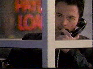 exits the post office and walks down the street until he finds a nearby payphone.
