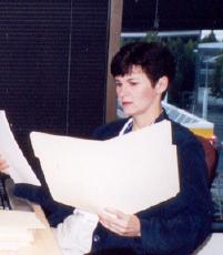 Kari Holmes is sitting beside the desk looking across at the coroner. Capt. Gerard and Eve Hilliard are standing behind her. It is apparent that a conversation has been taking place. Kari has a file in her hand and is looking at it. She looks across the desk to Dr. Alexander with a steely eye.