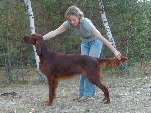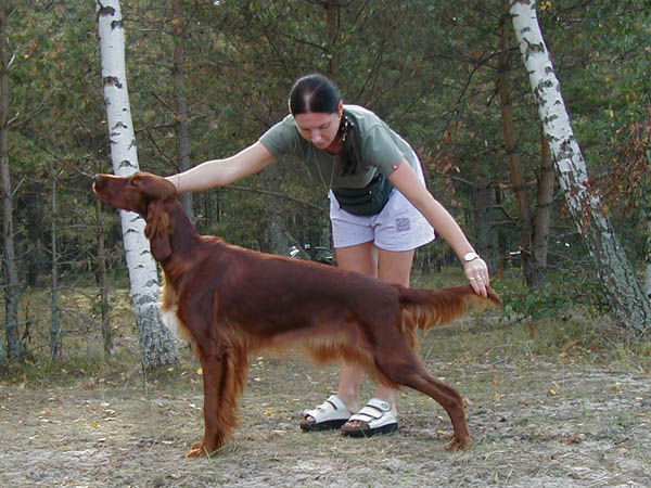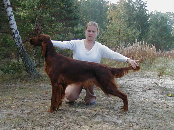 Indi's first litter of 8 puppies (4 boys and 4 girls) was born in September 2001 by Withersdale World Wide Web in "Field of Dreams" kennel in Estonia. Puppies are developing nicely and doing well at shows. "Annie", "Lola" and "Leonardo" are first setters in Estonia to achive FT qualifications. Below are some photos of them taken at 1 year old in September. Unfortunately "Foster" died suddenly just a short while after these photos were taken.