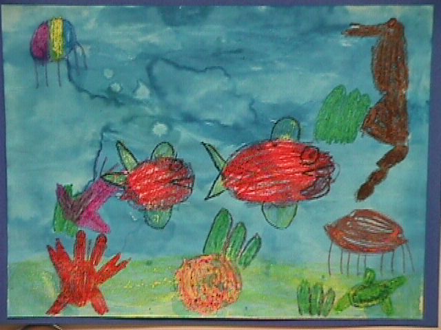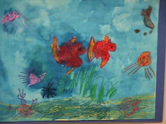 We used crayons and then painted over with blue watercolor paint.