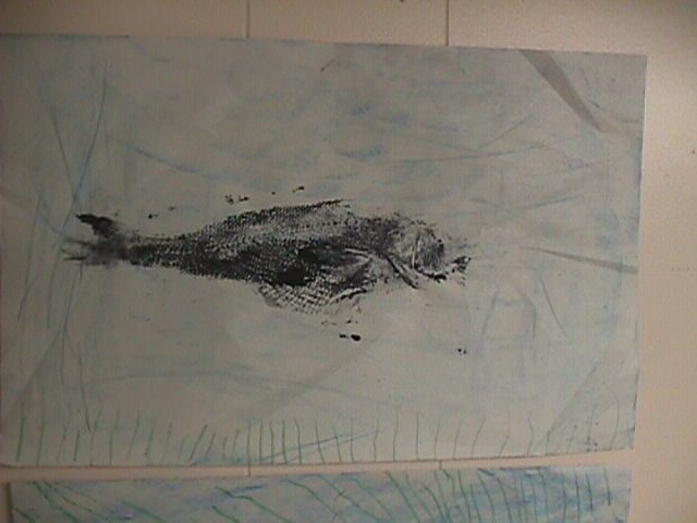 We made fish prints using a real fish. We used newsprint and
