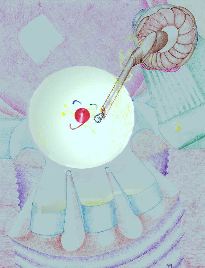 Color ink pen, color pencil and color screen on Bond paper 8X11, imaginary micro view of an energy input process, naive.