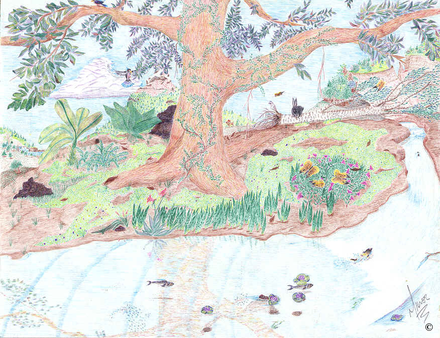 Color ink pen on Bond paper 8X11, imaginary landscape, attending in a casual moment to a boreal environemt, very detailed, naive.
