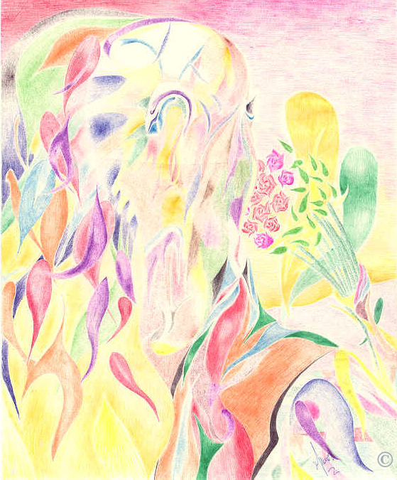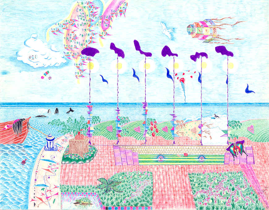 Color ink pen on sketch paper 7X8½, inter-posed images, meant in a "pensive" suspense, very colorful, very detailed, naive.