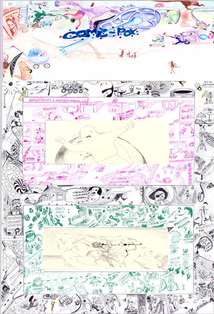 Color ink pen on Bond paper 8½X5, comic strip (top), naive perspective, very detailed."Collage", scribbled of comics all over (frame). "Rock on your back", (middle center) "Frozen rose", (bottom center), naive.