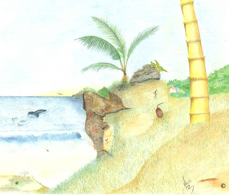 Color pencil on Bond paper 14X12, realistic (?) sea shore landscape, very vivid and fade, naive.