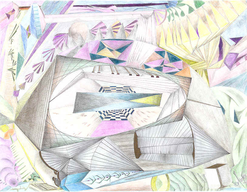 Color pencil on Bond paper 8X11, abstract and distorted geometric environment, very imaginative, naive.