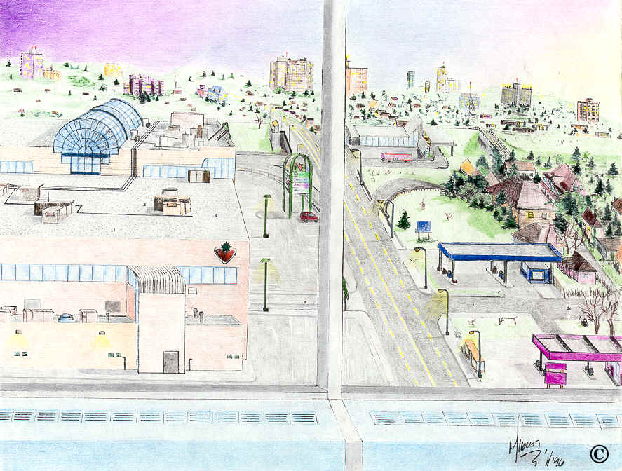 Color pencil on bond paper 8½X11, see through window landscape, colorful, very detailed,eglinton avenue/lansdowne area.