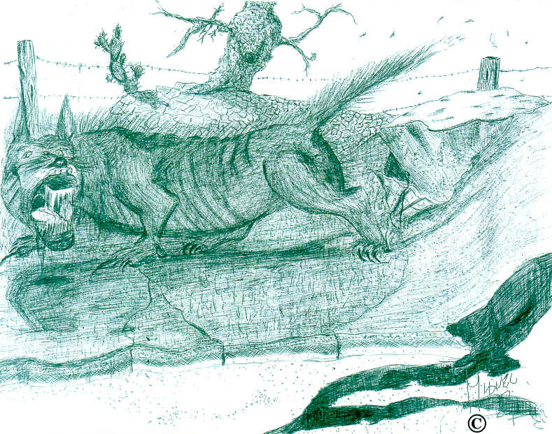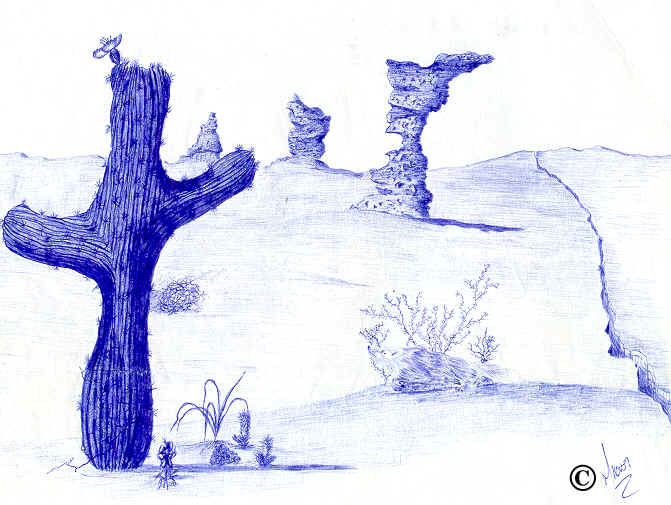 Green pen on Bond paper 8X11, arid scene, weird creature, very detailed.