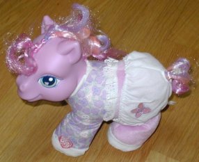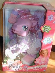 | 2005年の4月に買った子です。 デカベビーは初めて買いました。 MLPで通常フィギュア以外を買ったのもこれが初めてだったかな? 国際クロネコヤマトの送料にびびりってたのが遠い昔のよーに 思い出されます。 (今はもー全然平気(笑) 左前足のマイリトルポニーアップリケのところを押すと、 哺乳瓶を飲ますと、「んぐっんぐっんぐっ」と飲んで 付属品は |