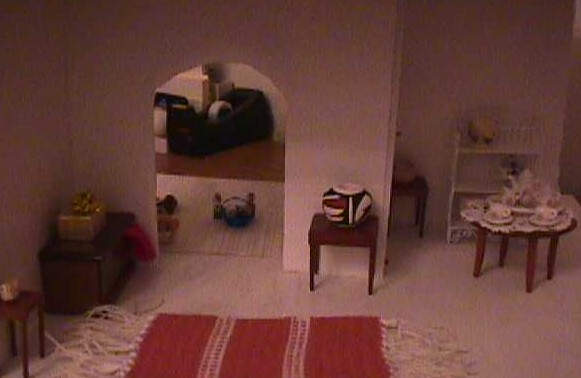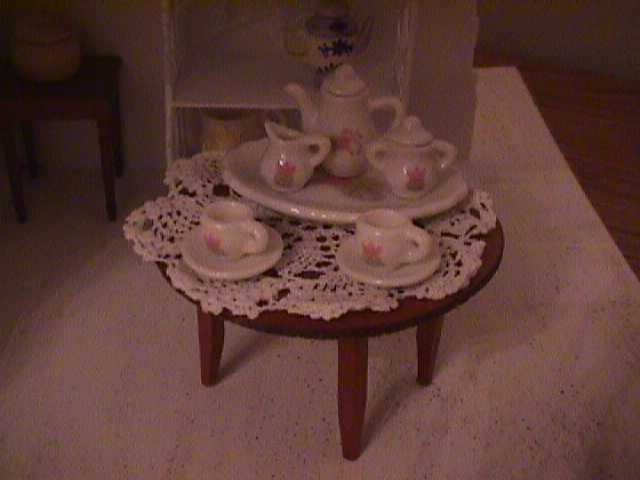 antique round table on her mother's hand-crotcheted doily. The beautiful handpainted