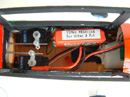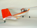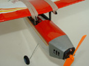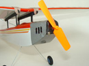 I reduced the plans to 67% to match the proportions of the Mini-Bell wing. The fuselage was covered with Econokote to match the covering on the wing. I made the motor mount for the GWS motor from an old Credit Card. Holes were drilled to match the screw holes and clearance for the hub. The plastic was then cut down to match the fuselage. The entire assembly was attached to the fuselage with small servo screws. To assist cooling I installed a GWS heat sink to the motor. The cooling slots in the cowl are functional.