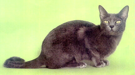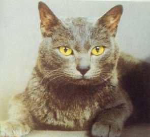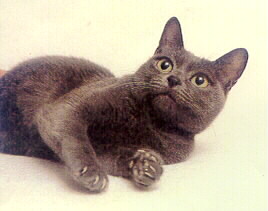 Pelaje: La capa del Korat tiene un atributo especial porque no se aplasta cuando se le sostiene o se le acaricia. Los cruces inadecuados podrían hacerle perder esta cualidad, así como su suavidad y sedosidad. Cada pelo es más claro en la base y posee un "tipping" especial, que aumenta altamente su calidad como excelente ejemplar si es muy plateado y crea un halo alrededor del cuerpo. Color: de color azul con un brillo plateado. Ambiente: El korat prefiere la vida hogareña con mucha armonia, ya que le pone muy nervioso los ruidos extremos, como los de la calle o los movimientos con mucho ajetreo.. Cuidados: Un cepillado diario con un guante-cepillo es recomendable para obtener ese brillo plateado especial del Korat. Igualmente es muy recomendable evitar infecciones víricas de las vias respiratorias, con las oportunas vacunas a tal efecto. Defecto: color no bien definido, cola terminada en bucle. |
