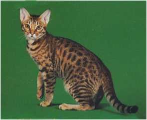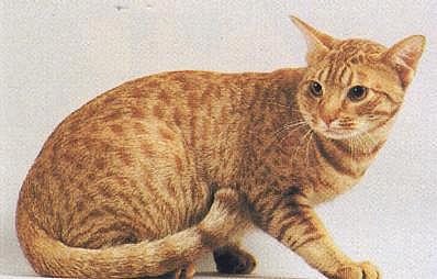 Pelaje: corto, grueso, suave, brillante. Color: tabby tipo egipcio (ocelote), crema con manchas y marcas color marrón claro u oscuro (ver egipcio). También hay capas con reflejos dorados o canela. Ambiente: requiere un jardín o al menos una terraza. Cuidados: Al ser de pelo corto, no precisa atención. Defectos: excesiva robustez, manchas blancas en la capa, cola retorcida, ojos azules. |