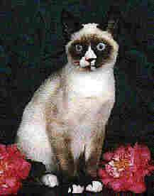 Pelaje: corto, brillante y no muy fino. Color: tiene los points oscuros del Siamés (máscara, orejas, patas y cola) y los guantes blancos de Birmano.