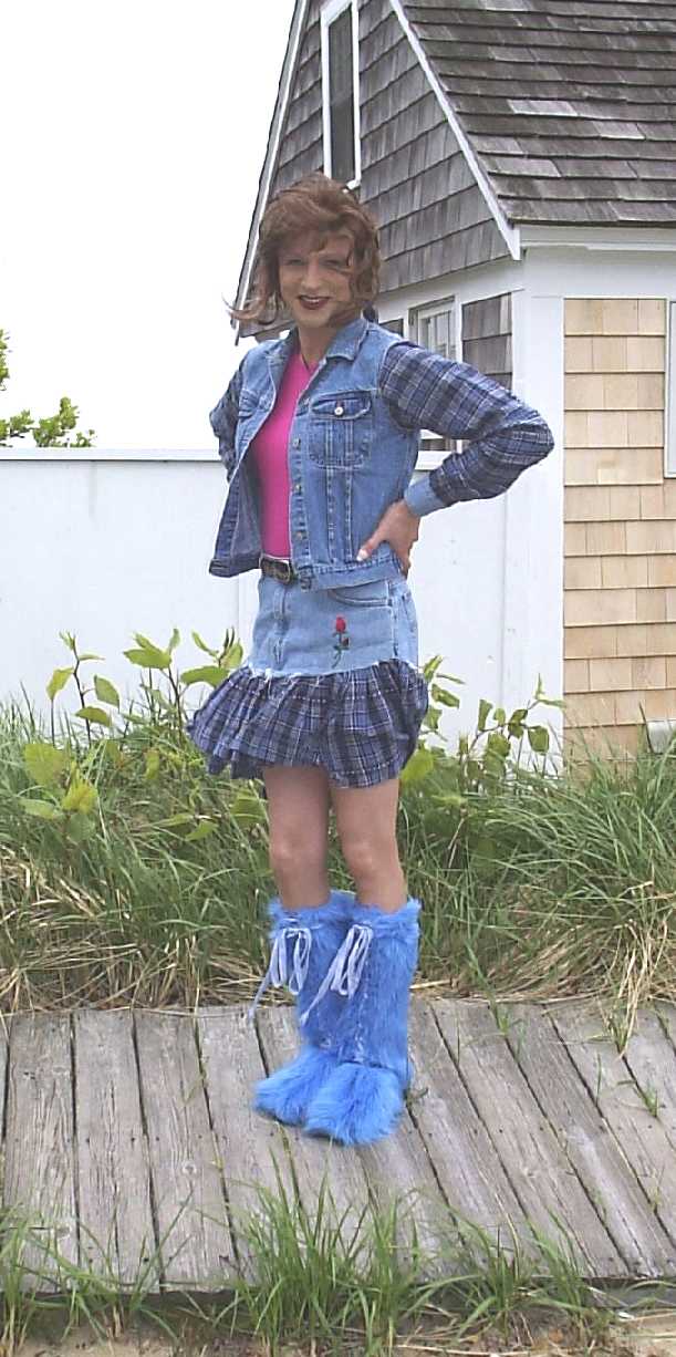 | Ahhh...furry boots! I've looked at those "apres-ski" boots for years, but I couldn't justify spending $200. So instead, I made them! I got some cheap slip-on shoes, and bought the fake fur on the Web. Then I used my devilishly crafty side, and *voila*. These are SO comfortable...and so totally fun. I had a blast just having them on, and I got a LOT of comments, from all sorts of folks. They're my absolute favorite boots of all time. Yes, they're goofy, but I love them! The outfit was another MishaCreation, using denim stuff I got from a thrift store and hacked to pieces. I bought some fabric locally, and made the sleeves and skirt to match. I even went the extra step of finding an old denim shirt, cutting off the cuffs, and attaching them to my flannel sleeves. I swear, EVERY year, I complain how I put wayyyy too much work into outfits like this, and swear I'll never do it again. Then the next year, I'm doing something even more preposterous. If you're a fan of faux fur like me, I have a link to a couple reliable retailers on my "Links" page. |