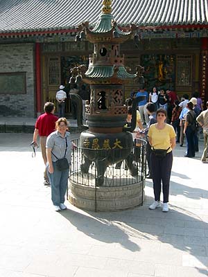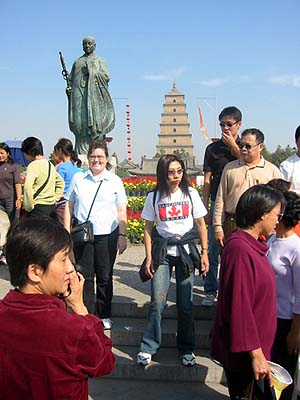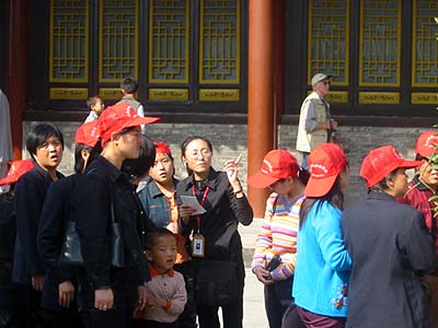 The statue is of the monk that brought back the sacred text from India, a favorite picture spot. Below is your average Chinese tour group, at least we did not have to wear a baseball cap.