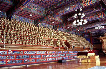 | This is Pirojon hall of Chikjisa temple in North Kyongsan Province. On the altar are hundreds of look-alike Buddha disciple statues. This temple is quite old- 1,580 years old, last being rebuilt in 1610 after being burnt down by Hideyoshi's troops during the Imjin War (1592-1598). |