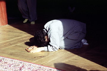 | ..a Buddist praying in a temple hall. Korean Buddhists genuflect like this in front of the image of Buddha. |