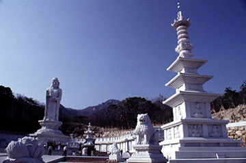 This is the Tongil (Unification) Buddha complex in the Palgongsan mountains near Taegu. The size of this semicircular complex is impressive. In the middle stands a huge Yaksa Yorae Buddha statue dedicated to the peaceful unification of the Korean peninsula. |