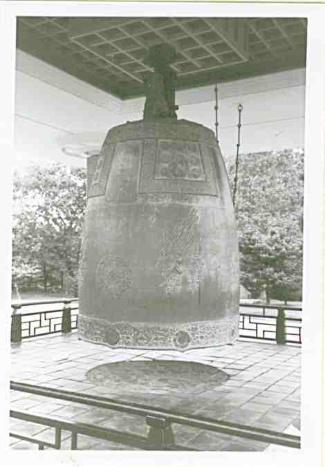 Here at the Kyongju National Museum hangs Korea's most famous bell. Known as the 'Emille Bell', it was cast in 771 to commemorate the Silla Dynasty's King Songdok. It's 3.5 meters high and 2.5 meters tall and weighs 23,000 kg. The name of the bell comes from the legend connected to the casting of the bell: After failed attempts to cast the bell, the temple's head monk was inspired by a spirit in a dream to find a young girl born in the year, month, day, and hour of the dragon. She was to be thrown into the molten casting metal before it was poured in order to appease the fire spirit dragon. This was done, and the bell was successfully cast. However, when they went to strike the bell for the first time, it didn't boom like a bell, but sounded with the mournful cry of the child for her mother in the ancient Silla langauge-"emille..". |