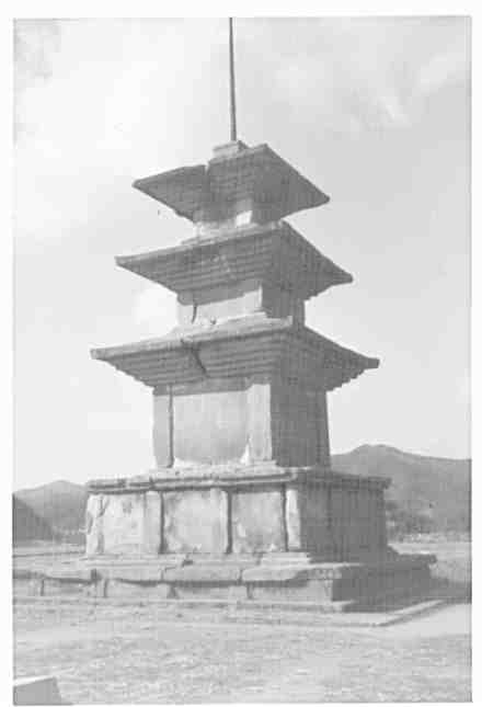 | One of the two identical 13-meter high pagodas of Kamunsaji, near Kyongju. The twin pagodas and the foundation stones are all that is left of this old Silla-era temple. Kirimsa Temple was a large and influential temple in the Silla Dynasty, and was much grander than Pulguksa at the time. |