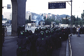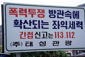One thing the traveller to Korea will notice almost immediately is the evident importance of national defense in this divided nation. Signs just like this one are present all over South Korea, giving various warnings to the population about the threat from North Korea. The rhetoric of this particular sign alludes to the threat posed by those who demonstrate opposition to the southern government. Translated, it reads: If you just stand by and let violent demonstrations happen, then leftists will take over. If you have information on infiltrators or informants call 112 or 113. |