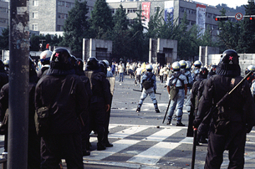 | ..the students in the background taunt the riot police. During this particular confrontation, the two sides just stood and threw rocks and pieces of brick at one another. |