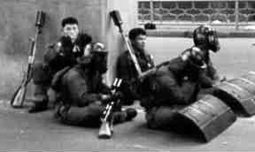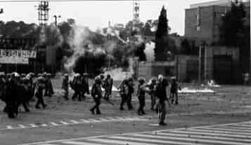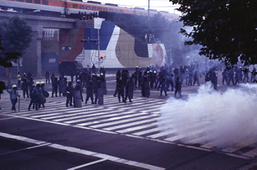 ..the riot police move in and battle the students using truncheons, CS grenades, and CS powder. |