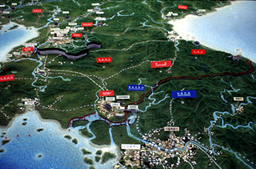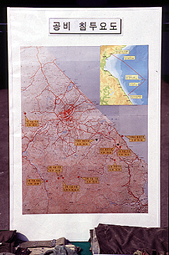 | Infiltrators (from North Korea) actually are a reality in South Korea. This map was part of a government exhibition at Seoul Station where the contents of the North Korean submarine that landed near Kangnung on the east coast in September, 1996 were displayed. The map shows a section of the east coast where the sub landed, and shows red dots where the South Korean Army killed infiltrators as they tried to flee back into the North when their mission failed. |
