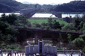| The blue-painted bridge on the left is the only link to the JSA, and is called 'freedom bridge'. The wooden bridge in the middle is where POWs were allowed to cross back into the South at the end of the war. In the foreground is a memorial place for southern families who have relatives in the North. This is the furthest north that they can travel. |