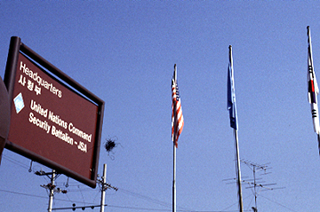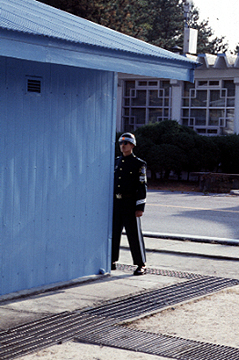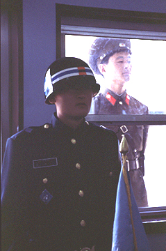 | A southern soldier stands in the MAC building stradling the actual border, with his left foot in North Korea and his right foot in the South. The soldier looking in is a North Korean standing on the northern side. The flag on the table is the U.N. flag. The North Koreans also used to have their flag here, until the summer of 1995 when the northern government declared the armistice a "worthless scrap of paper", and took their flag off the table. |