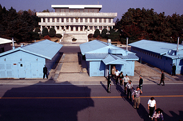 | This is 'Conference Row'. These blue and silver buildings are bisected by the actual Military Demarcation Line that separates the North and South. They are the places where the opposing militaries and governments meet. In the background is North Korea and the headquarters building for the North Korean Security Forces called 'Panmungak'. It also where Northern tour groups enter and exit to visit Conference Row. In the foreground, a tour group exits the Military Armistice Committee building in the South. |