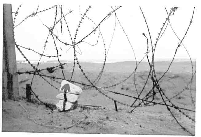 | This is part of the 'security system' that protects sections of the east coast of South Korea. If infiltrators from the sea try to pass the barbed wire, they will knock down the stack of painted rocks. Soldiers passing by will see that the stones have fallen over, and the hunt will be on! It only goes to show that closely observing and defending hundreds of miles of coastline is next to impossible. |