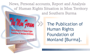 Dear Readers, Human Rights Foundation of Monland (HURFOM) was founded in 1995, by a group of young Mon people. The main objectives of HURFOM are: - To monitor human rights situations in Mon territory and other areas souther part of Burma, - To protect and promote internationally recognized human rights in Burma, In order to implement these objectives, HURFOM has produced “The Mon Forum” newsletters monthly and sometimes it has been delayed because we wait to confirm some information. We apologize for the delay. However, we also invite your feedbacks on the information we described in each newsletter and if you know anyone who would like to receive the newsletter, please send name and address to our address or fax number or e-mail to us. With