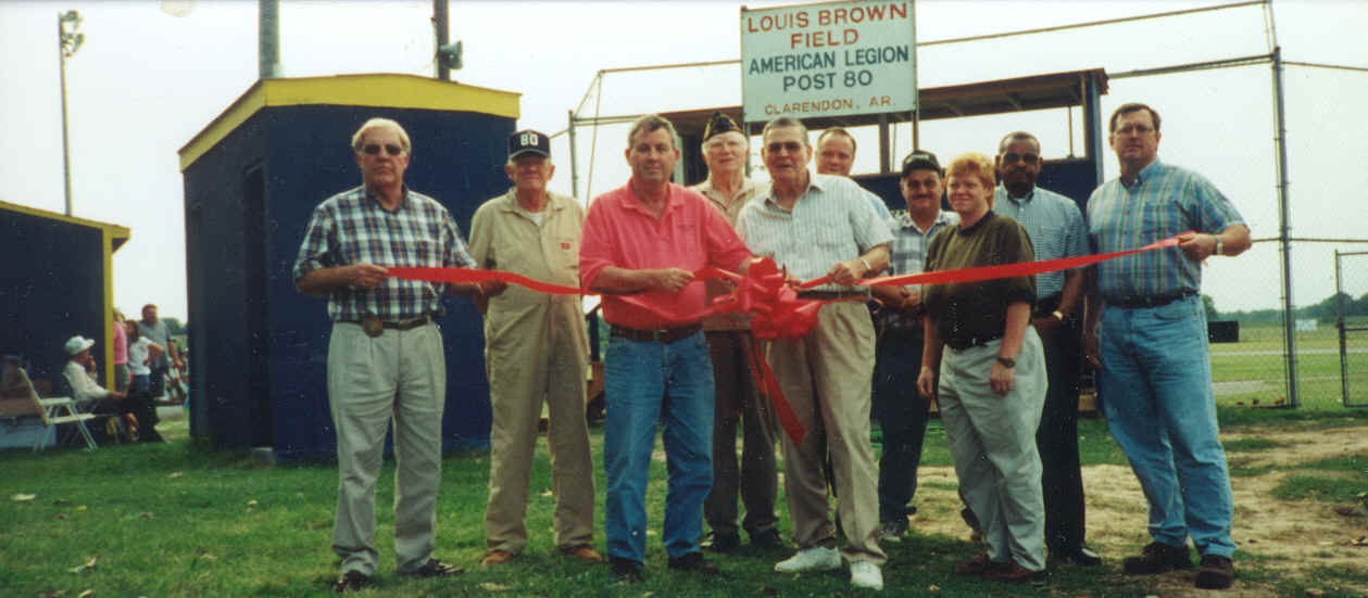 A ribbon cutting ceremony was held recently at the American Legion Pony League baseball field in Clarendon. The ceremony was held in honor of the new lights that were installed recently on the field. Honored guests attending were (from left to right) Sheriff Billy Joe Morris, Johnny Roberts, Mayor Don Boshers, Jake Breeding, Monroe County Judge Tom Catlett, John Hastings, Ronnie Morris, Dee Jones, L.E. Cole and City Attorney David Carruth.