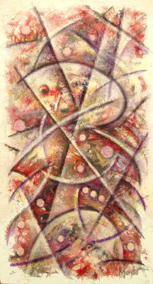 The theme of life is expanded further in this work. The use of red and intertwining shapes within this narrow format produces excitement. An emerging figure appears to be on the move. size - 12x24"