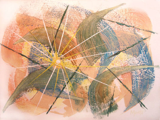 Bold, sweeping forms unite together through overlapping and directional shapes. The greenish gold colours create depth against the light brown shapes. Radiation from the yellow sun produces power and glory. Size 30x40"